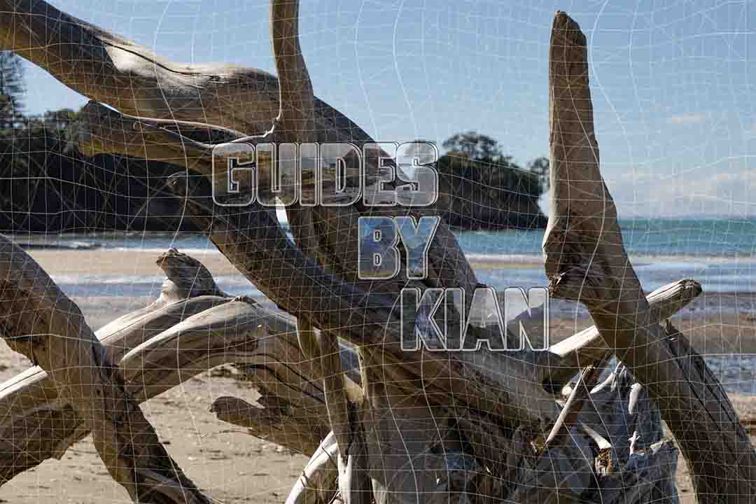 The serene shoreline is framed by pohutukawa trees with the iconic Waiake Island just offshore-an inviting landmark thats adds to the beach's natural beauty and coastal charm.